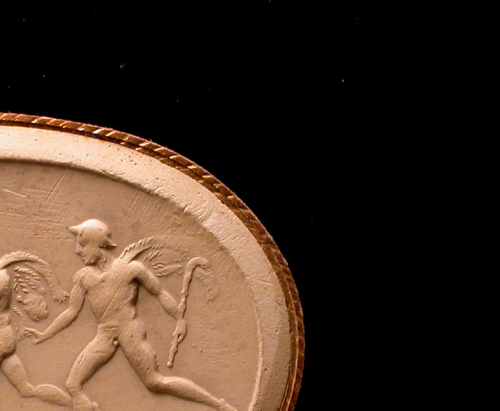 40000730, Poniatowski, T700, THE INFANT CAECULUS [SON OF VULCAN, CONCEIVED WHEN A SPARK OF FIRE FROM THE HEARTH FELL INTO HIS MOTHER'S LAP, EXPOSED BY HER NEAR THE TEMPLE OF JUPITER] FOUND IN THE FIRE BY SHEPHERDS. [CAECULUS WAS THE FOUNDER OF PRAENESTE], KROMOU, Kromos, Prendeville, J.: Explanatory catalogue of the proof-impressions of the antique gems possessed by the late Prince Poniatowski and now in the possession of John Tyrrell, Esq. (1841), Christie's, London, Catalogue des pierres gravées antiques de S.A. le Prince Stanislas Poniatowski ([1830?]-1833), 700, Cornelian