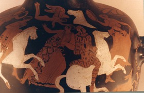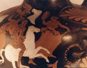 Decoration: Body: HORSEMEN (ONE IN THRACIAN COSTUME) PURSUING WOMEN, ONE WITH TYMPANON, EROS PANTHER, DEER, HORSE