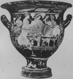 Decoration: A: SYMPOSIUM, YOUTHS RECLINING ON KLINAI, TABLES WITH FOOD, WOMAN PLAYING PIPES, GRAPES SUSPENDED B: DRAPED YOUTHS, ONE WITH ARYBALLOS AND SASH, ONE WITH STAFF, DISKOS AND WRITING TABLETS SUSPENDED