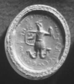 Description: ABRAXAS (ANGUIPEDES WITH A COCK'S HEAD), HOLDING SHIELD AND WHIP. INSCRIPTION IN THE FIELD.
