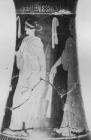 Decoration: A: DOMESTIC, WOMEN, ONE SEATED, WITH MIRROR, BOX AND ALABASTRON, WREATH, ALABASTRA AND CAP (BAG ?) SUSPENDED, PLANT B: WOMEN, SOME WITH PLANTS Stand: DOMESTIC, WOMEN WITH FILLET, WREATH, FILLETS SUSPENDED, STOOL (?) Under handle: NIKE FLYING WITH FILLET