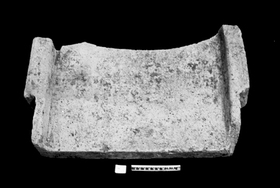 Remarks: Type II Late Archaic pan tile front half with both raised side edges. Underside flat, uneven. Stamp in center equal to depressed circular channel, Diam 2.2. Cutout left indentation H 2.5, D 11.7, right 2.5, D 11.7.
