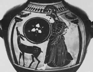 - Decoration: Body: ATHENA AND DEER BETWEEN COLUMNS WITH COCKS, SHIELD DEVICE, DISCS