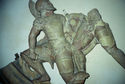 Remarks: Statues in round of 2 warriors in combat, left figure (MPH 45.5) kneeling in profile to left with helmeted head turned back & upward, right figure advancing to left. Both figures wear cuirasses over tunics, thigh guards & greaves (H 16.5). Left figure holds shield on left arm (Diam 25) & sword with curved blade in lowered right hand, & rests right foot & left knee on horizontal border (H 3.3, D 5.5) painted with meander. Along left lower side, wide volute band (missing volute at top) with 2 channels, connected to horizontal border by flat plaque (Th 2) painted cream with red & black circles; outer edge of volute band formed by cutout wave pattern (H wave 7.4, Th 2), painted black with cream outlines.