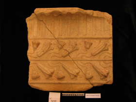 Remarks: Raking sima vertical plaque with widely spaced convex strigils above floral frieze with lily cups and roses growing obliquely and in alternating pairs from horizontal stalk in middle. Finished right edge and full height of plaque with double row of lilies. Here separately made vertical plaque with 3 nail holes in horizontal projection of strigils for cresting and finished bottom edge inserted into tile backer. H lower roll 1.6. H lower fascia 3.3. W interstices 1.3. Diam nail hole 1.7. 3 nail holes. H lily 9.2, W 5.8. H rose bud 4, W 4.1. Along finished right side, vertical groove W 0.7. At lower right corner, finished cutout edge below lower roll, W 4.1. From Koller Collection.