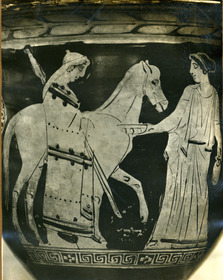 - Decoration: A: YOUTH IN THRACIAN COSTUME, WITH SPEARS, DEPARTING, WOMAN WITH OINOCHOE AND PHIALE, HORSE
