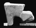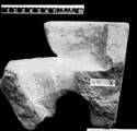 Remarks: Fragment preserves left front corner of base with raised wall (H above floor 5, W 2.5-3.1); at left, thick foot & deep arch into which oblique hole from floor opens (D 1.5) as well as large curved opening near center of floor. To right at bottom, line of curved ridge tile (Th 2.5). Th floor 2.8