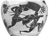 Decoration: A: GIGANTOMACHY, POSEIDON, WITH NISYROS, AND GIANT (POLYBOTES ?) IN NEBRIS FALLING, SHIELD DEVICE, IVY WREATH B: GIGANTOMACHY, POSEIDON, WITH NISYROS, AND GIANT (POLYBOTES ?) FALLING