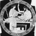 CAVI Subject: Int.: symposium: a bearded man reclining; a woman cup-bearer with cup and