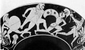 CAVI Subject: Int.: youth putting on greaves. A: Heracles and the Amazons: Heracles attacks