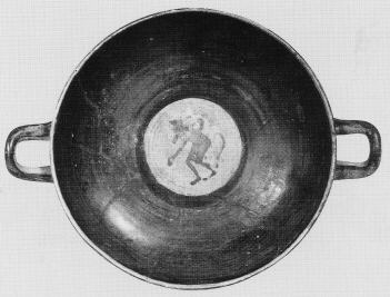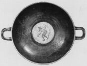 Decoration: A,B: DIONYSOS SEATED ON BLOCK WITH DRINKING HORN AND GRAPEVINE, BETWEEN MAENADS WITH WREATHS, SOME SEATED ON BLOCKS, ONE ON STOOL, AND SATYRS I: SATYR Under handle: DOLPHIN