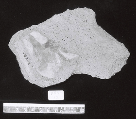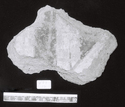 Remarks: Thick fragment with 2 flat surfaces with painted decoration on both faces, not quite parallel. On one face, white band with central brown line/black band with central brown line/white area with brown line forming V, with purple-red on half of inside of V. On opposite face, painted purple-red stem with heart-shaped end, superimposed over black curving band, on white ground; part of second curved purple-red element, possibly mirror image of heart-shape.