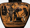 Decoration: Body: HERAKLES WITH KANTHAROS AT PITHOS, PHOLOS WITH STONE LID, ATHENA, CENTAURS, CAVE ROCK Shoulder: WARRIORS, ONE ARMING, WOMAN, DRAPED YOUTHS WITH SPEARS, ONE SEATED, DEVICES DISCS