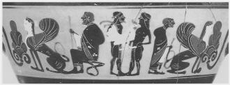 Decoration: A: COURTING, MAN AND YOUTH BETWEEN DRAPED MEN, ONE SEATED ON STOOL, BETWEEN SPHINXES B: COURTING, YOUTHS BETWEEN MAN AND YOUTH, BOTH DRAPED AND SEATED ON STOOLS, BETWEEN SPHINXES