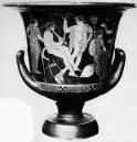 Decoration: A: APOLLO WITH LAUREL, MARSYAS SEATED ON ROCK PLAYING PIPES, SATYR AND MAENADS WITH THYRSOI, LYRE, POINTED AMPHORA B: SATYRS AND MAENADS